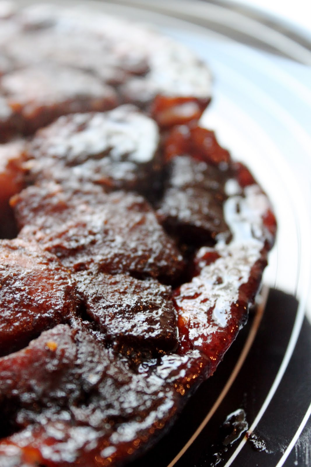 A la sortie du four, poser sur le dessus du moule un plat de service et retournez d'un coup le tatin en prenant soin de bien tenir le tout avec des gants.