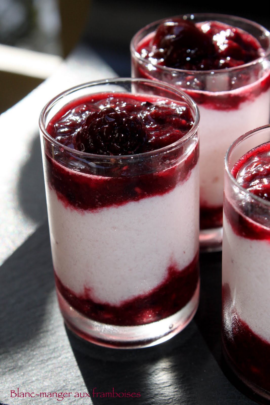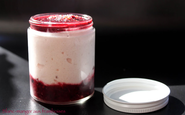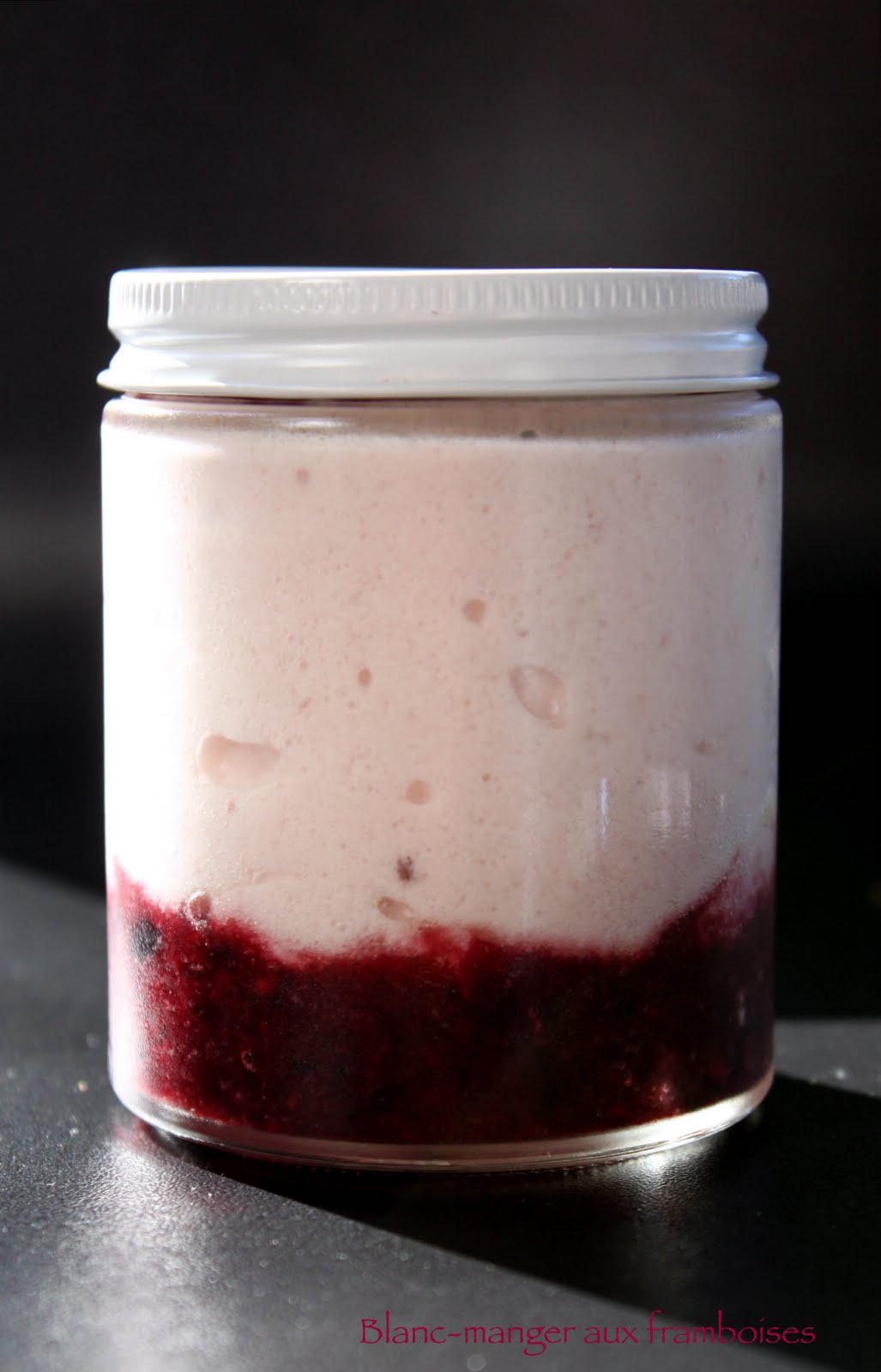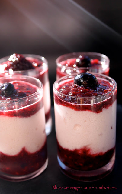 Par le plus grand des hasards ( car j'ai peu de magazines de cuisine français à la maison ) je tombe ce matin sur une recette de " blanc-manger aux framboises " de Cyril Lignac qui, offre une " pause gourmandise light " en double page centrale.