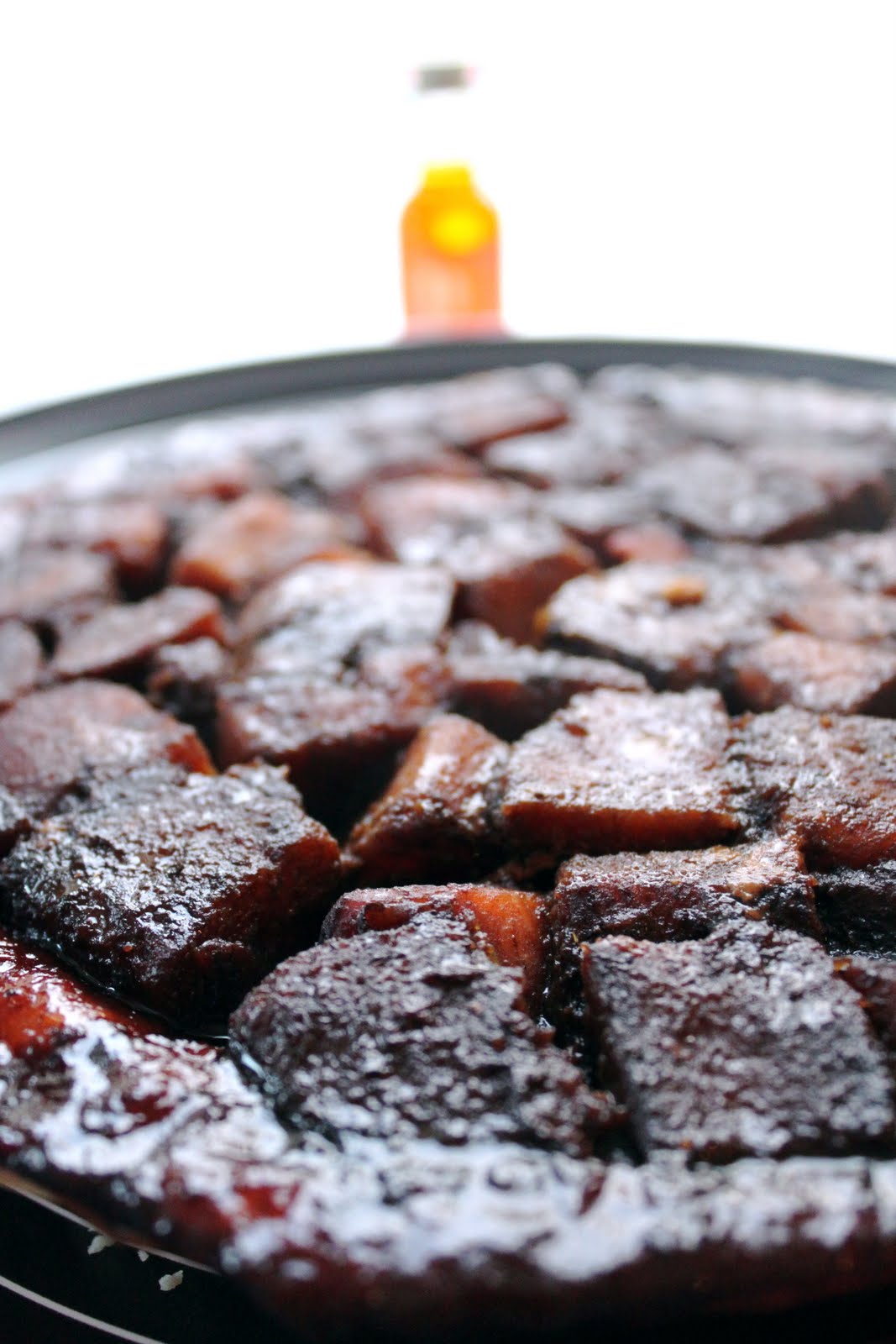 Vinaigre balsamique, cassonade et miel caramélisent parfaitement le potiron ce qui lui ôte sa jolie couleur orangée. Au profit de cette façon de le cuisiner, le caramel adoucit plus encore la finesse en bouche du potiron. Associé à la marinade du saumon fumé, la couleur peut apparaître au final déroutante mais là est bien la caractéristique du tatin. Observez les gros plans des cubes de potiron ... le fondant au centre est conservé, seule une fine pellicule recouvre et caramélise l'ensemble de la tarte. L'association potiron-saumon est très agréable : le fumé du saumon relève la douceur du potiron. Aventuriers, je vous conseille l'expérience.