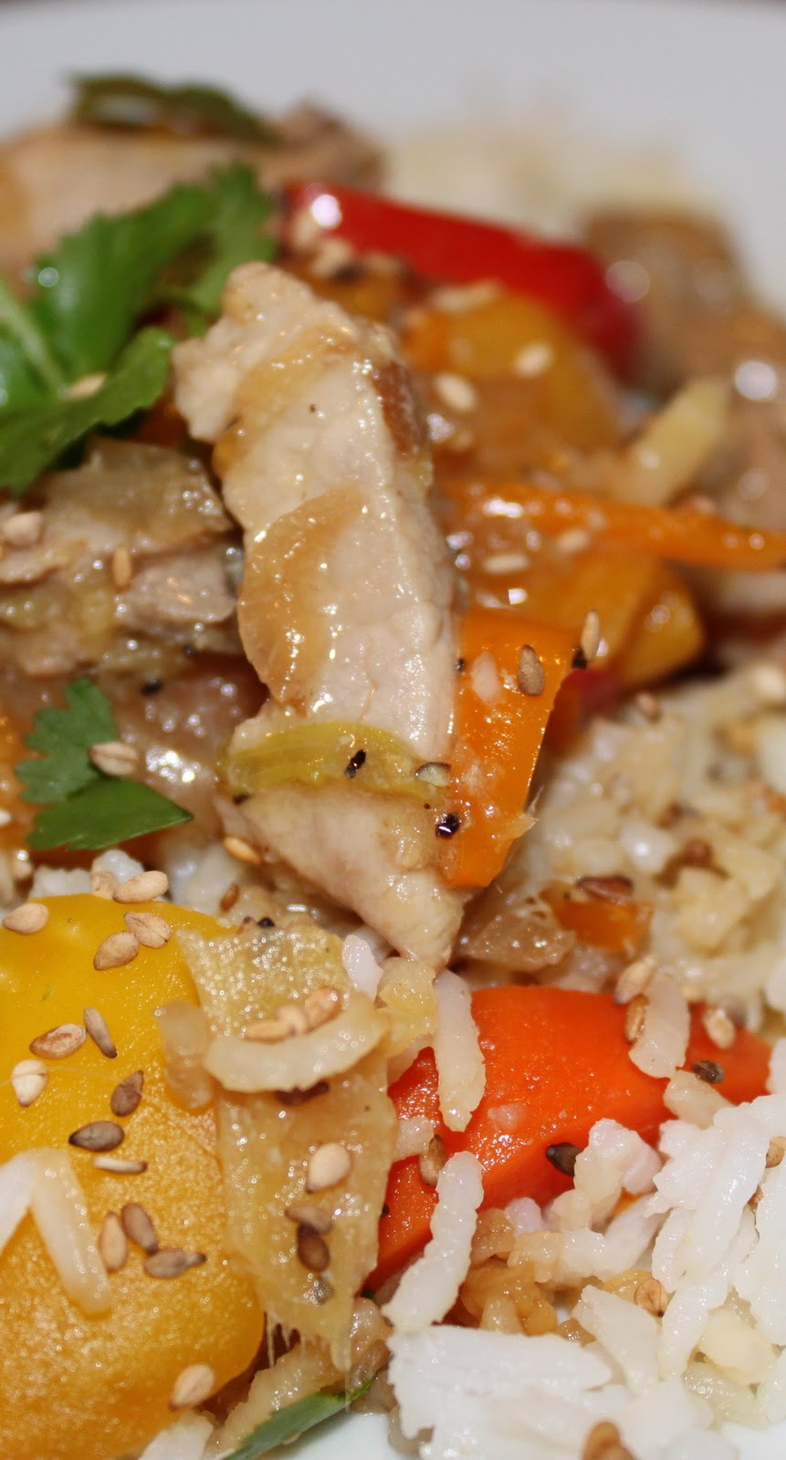Parsemez des graines de sésame grillées et de la coriandre fraîchement ciselée et servez accompagné de petits légumes croquants et/ou de riz blanc.