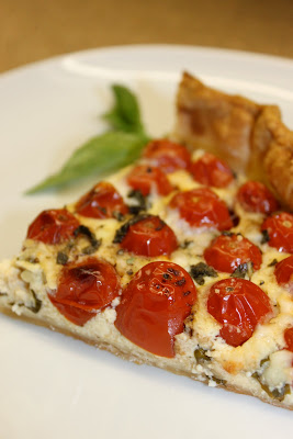 Sortez la tarte du four et délayez l'huile d'olive et le vinaigre balsamique puis arrosez l'ensemble de la tarte sur les 2 dernières feuilles de basilic découpées en leur moitié préalablement déposées sur l'appareil.