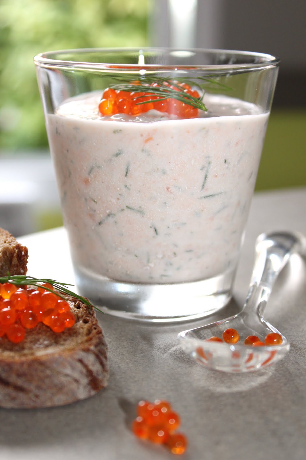 Mixez ensemble le fromage blanc et les faisselles, la truite fumée et sa marinade.