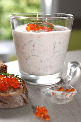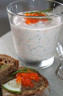 Au moment du service, décorez d'oeufs de truite, de brins d'aneth et de minis quartiers de citron vert.