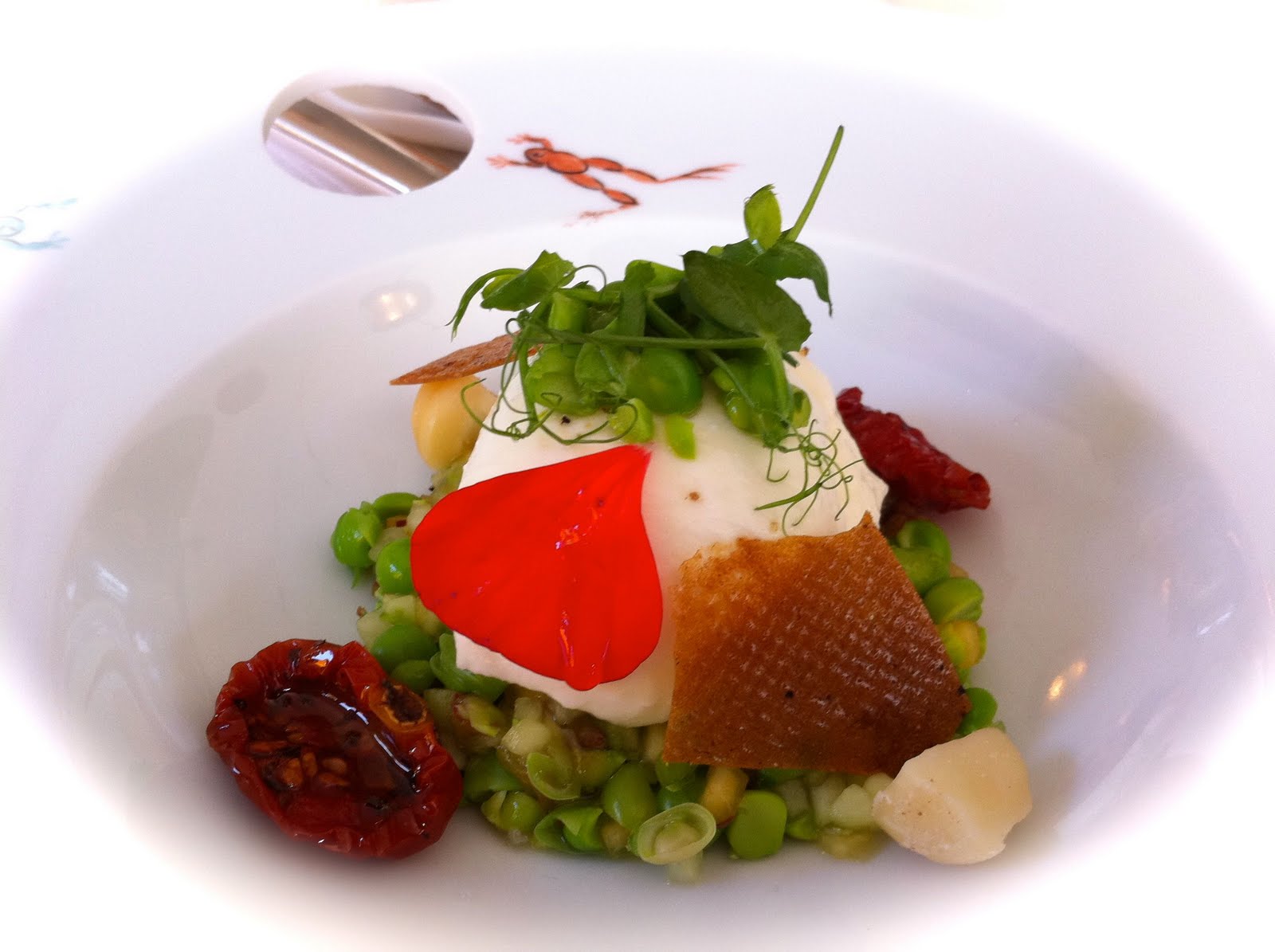 Burrata crémeuse, petits pois - géranium, pêche,