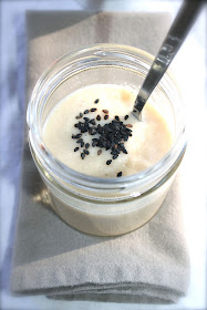 6- Servez bien chaud accompagné d'une tranche de pain complet grillé et frotté à l'ail et d'une pincée de curcuma ou de graines de sésame noires ( je trouvais joli le blanc du velouté accentué par la touche de lait qui contrastait avec les graines ... mais c'est mon truc ! ).