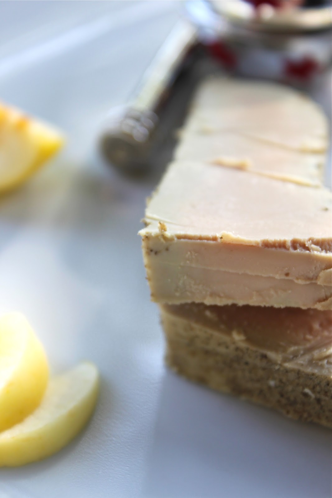 Soigneusement préparé et cuit avant mon départ, mon foie gras, prêt et impatient de se faire déguster ce soir, n'attendait plus que mes coups de projecteur sur sa jolie couleur.